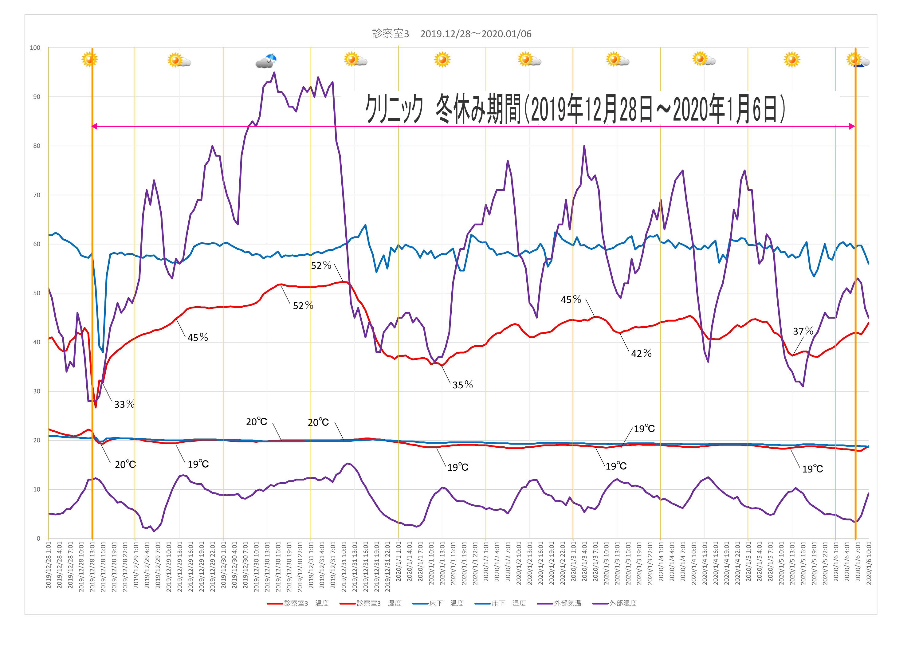 上記は、誠風庵で建築したクリニックの、冬休み期間(無人・無暖房)の状態の温度と湿度のデータです。 暖房がなくても、室温がほぼ20℃を維持しています。2019~2020年は確かに暖冬ではありましたが、それでも最低気温は1.7度の日もありますので、この建物の性能が分かっていただけると思います。
