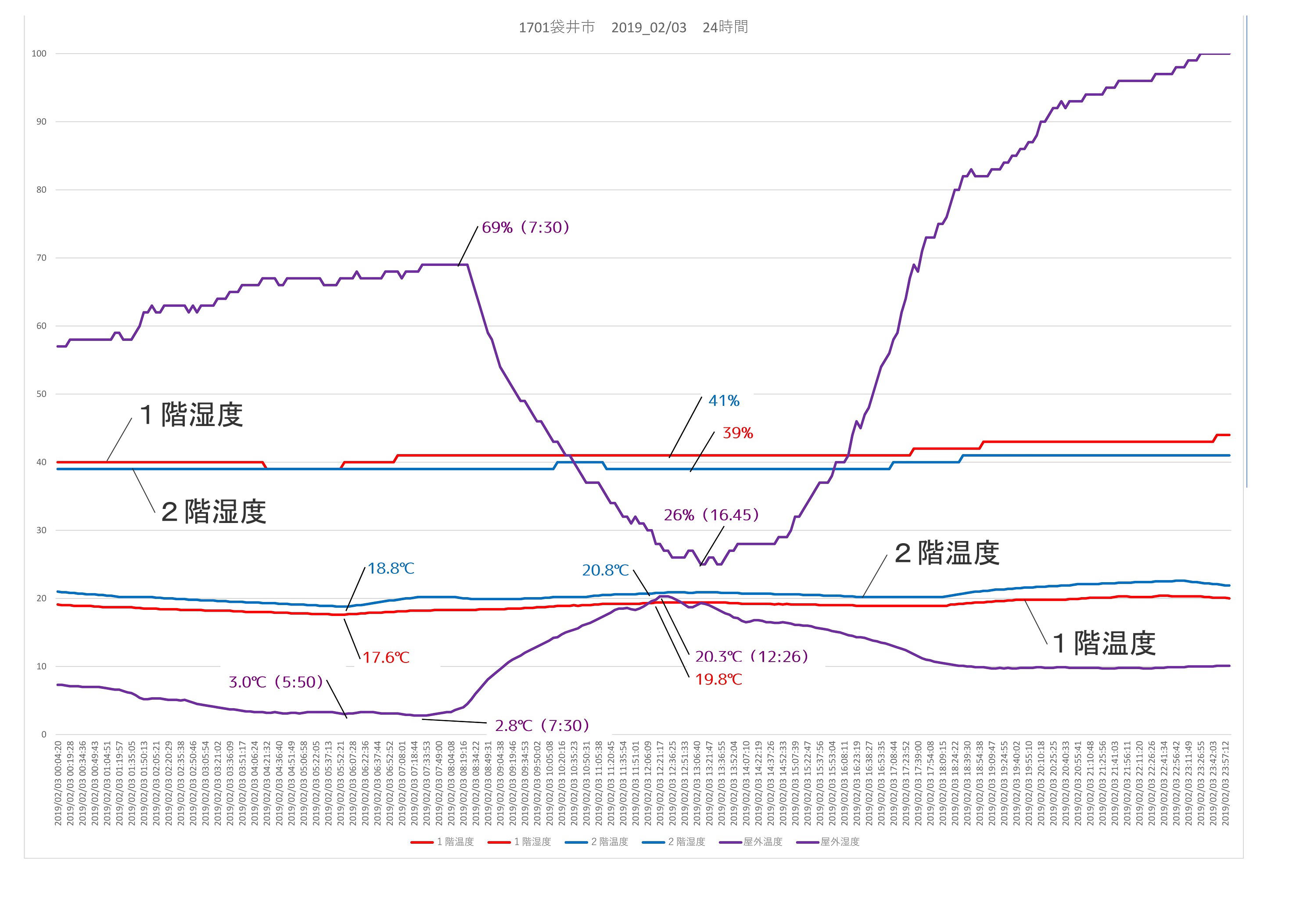 2019年2月3日の一般住宅の温度と湿度の実測データです。 赤が1階、青が2階です。 朝1時間、夕方から約3時間、1階の14畳エアコン1台を稼働させていますが、ちなみに この家70坪もある二世帯住宅です。 足りない分をちょっとお足しする程度の暖房で暮らせてしまいますので、かなり省エネです。室内の快適さが分かります。