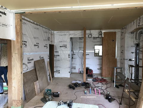 ○室内側の床壁天井には、可変透湿防水シートを張ります。壁体内の内部結露防止に 必要な措置です。