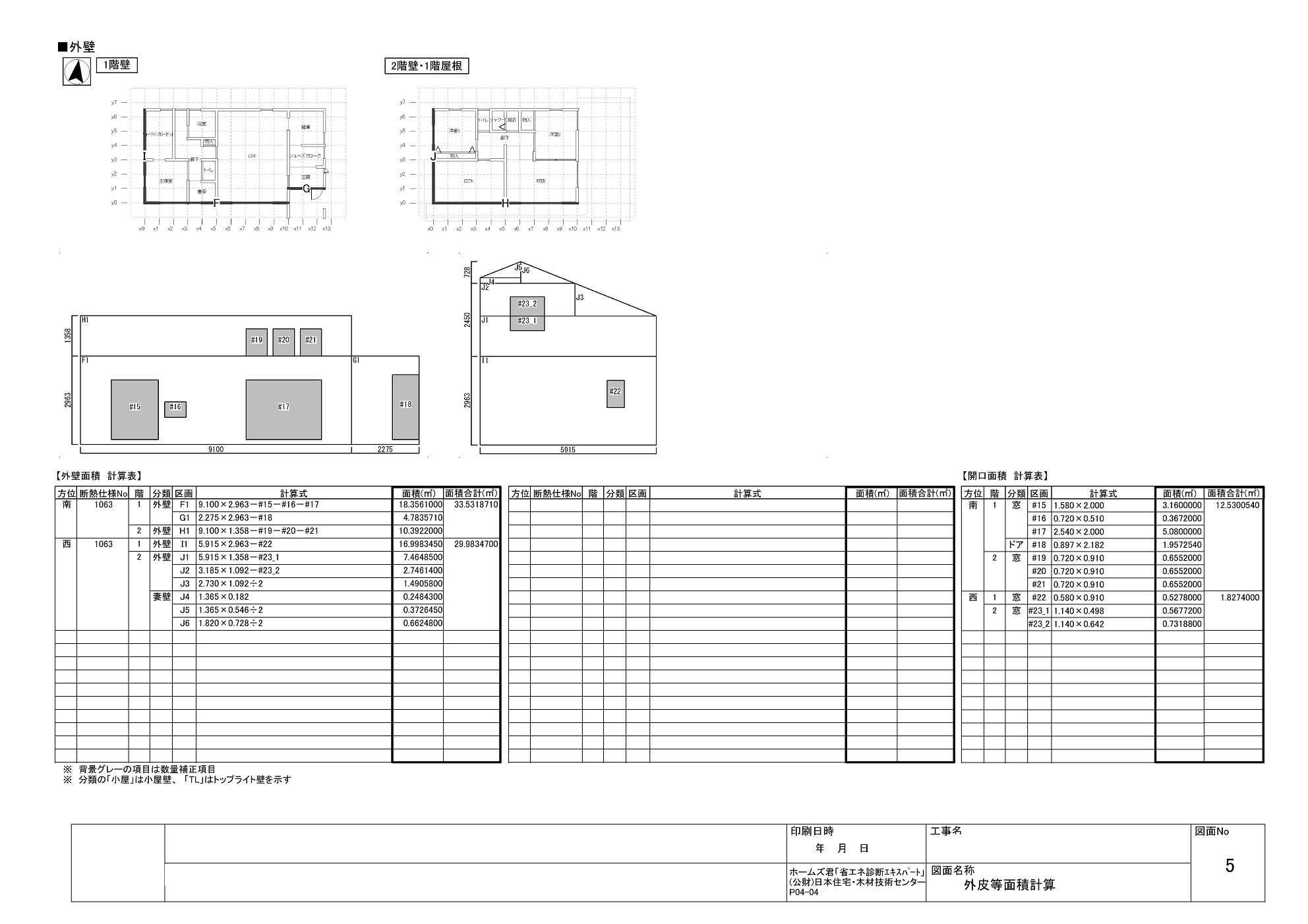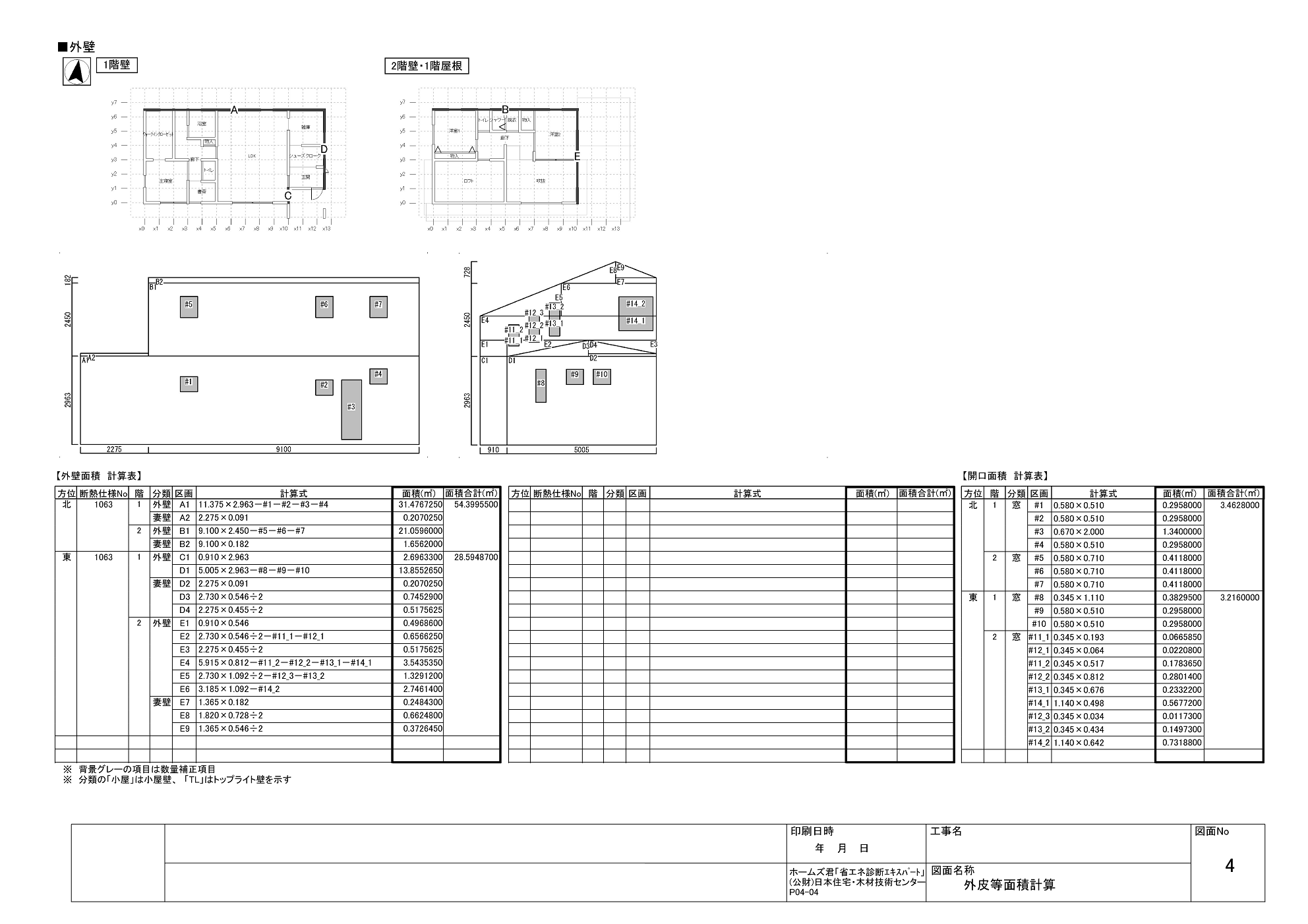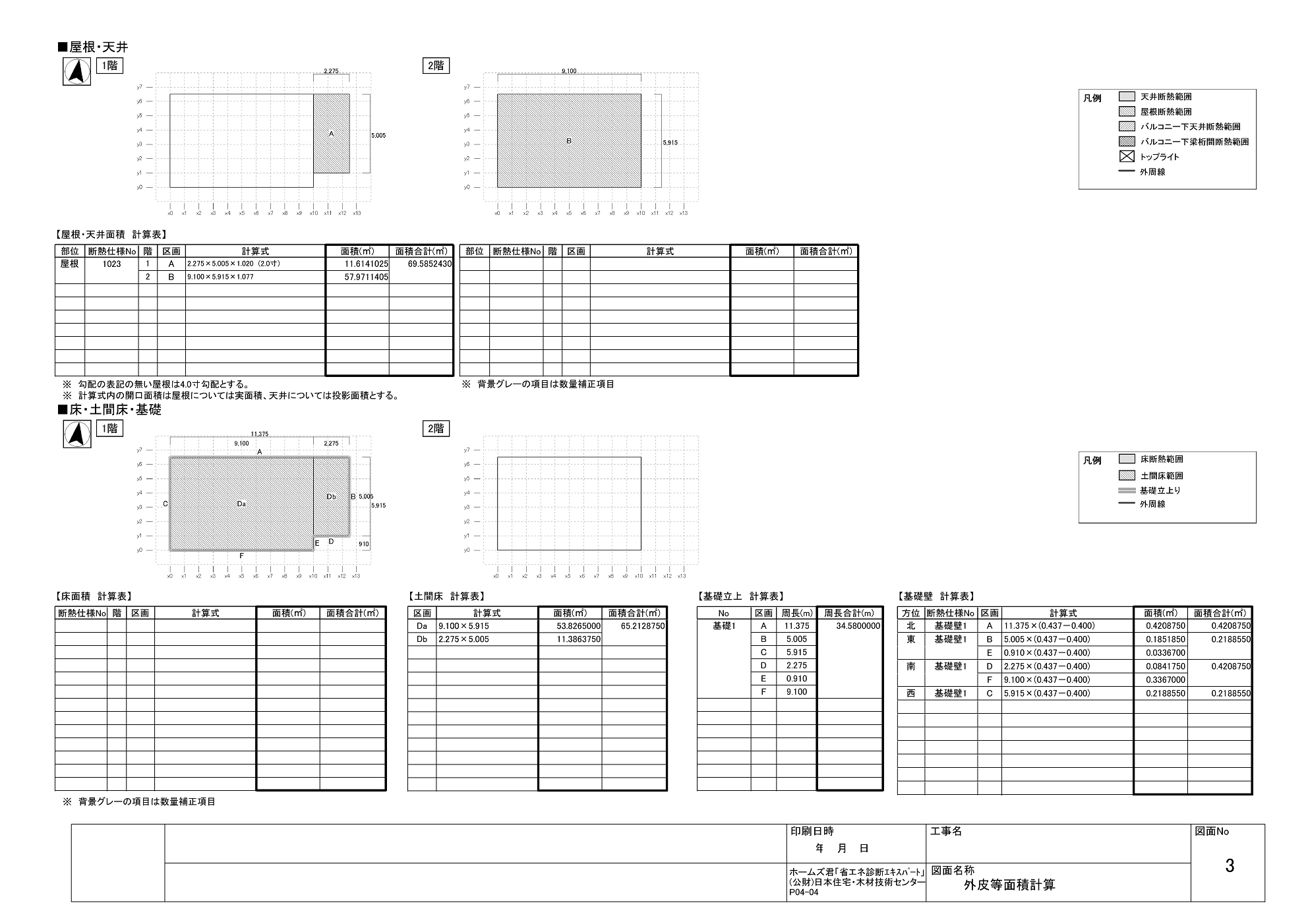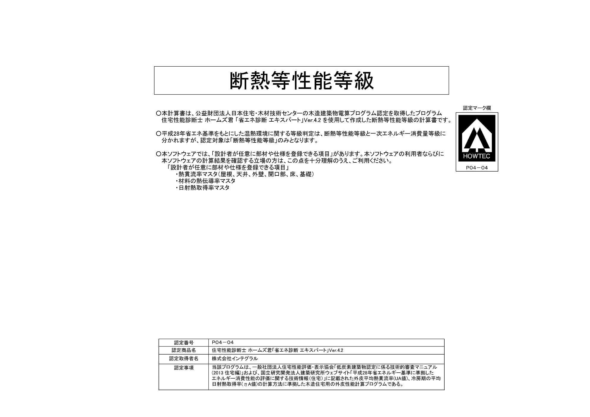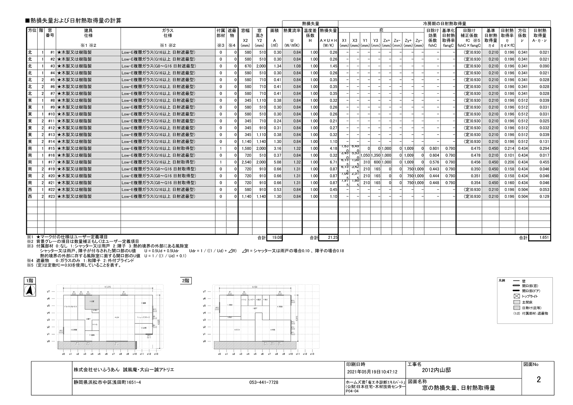 温熱計算にもいろいろなやり方がありますが、外皮平均熱貫流率(UA値)、冷房機の平均日射取得率(ηAC値)、断熱等性能等級を算定します。