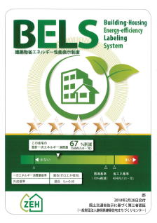 建築物の省エネルギー性能表示制度(BELS)ゼロヨン住宅 UA値0.40w/㎡K 日射取得率 暖房機 ηAH=1.5 冷房機 ηAC=1.2 太陽光パネル7.2kw BEI=0.33(67%削減) |